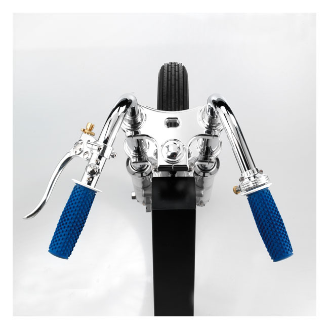 Without hole for risers. Kustom-Tech's billet CNC machined triple trees; for 39mm fork tubes; are super narrow. With just 146mm (5 3/4") center to center fork tubes they are 1 1/4" (31.75mm) narrower than stock Narrow Glide triple trees. Riser holes are 2 1/2" center to center; 1" closer together than stock. Comes complete with 1" diameter steering stem; bearings and external forks tops. Note 1: Make sure you will be able to mount the front wheel & brake set-up of your choice. Note 2: Trees come with external fork stops. Internal forks tops can be ordered separately; if required Note 3: Ribbed fork tube caps can be ordered separately and used with the 'No Hole' triple trees. They come with M34 x 1.5 thread. Handlebars can be welded to the fork tube caps and give an ultra clean look.