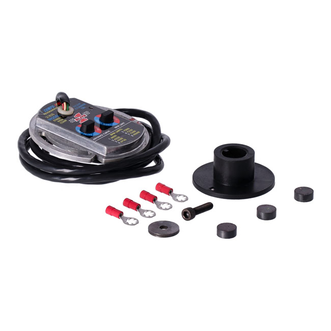 Kickstart special; for use with kick start only. Sames as 538404 but with delayed timing to TDC below 300 RPM to prevent kickback. Comes with selectable single/dual fire and/or single/dual plug. Selectable advance & RPM limiter. With 8 advance curves and 8 RPM limits; from 6000 up to 7500 RPM; it can be adjusted to fit your specific engine. Easy selection by a rotary switch on the ignition unit. All modules come with a built-in static timing light and feature a extended temperature and low voltage operation. Note: A tach adapter (MCS 538408) is required to correct tacho-output when using single fire ignition; for correct RPM representation.