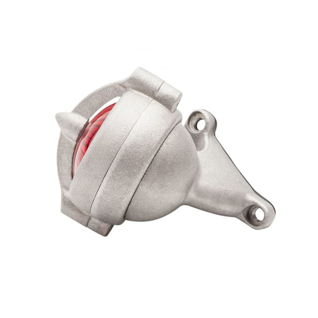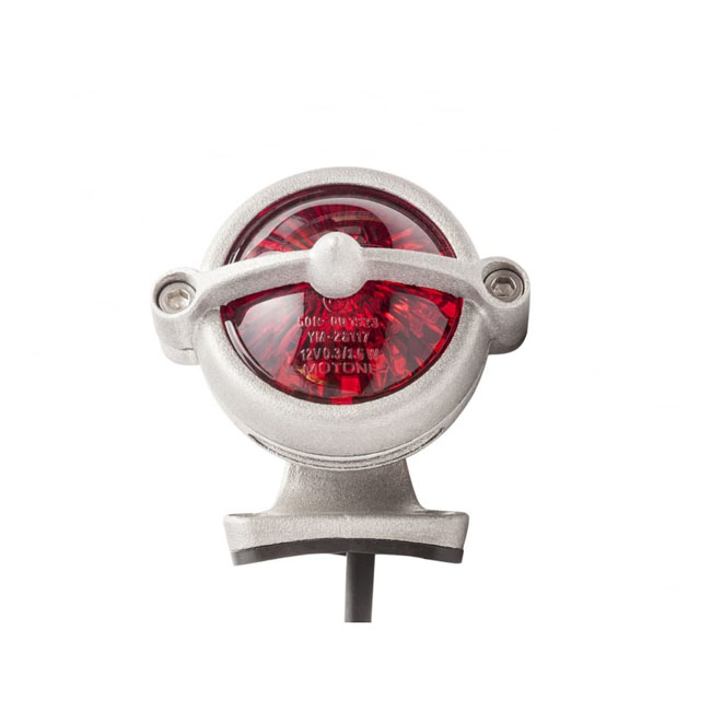 Shot blast finish. ECE approved. Manufactured from die-cast aluminum but complete with modern and much more vibration-proof LED lighting. License plate illumination is done through a slot in the under side of the taillight body. Includes a style matching mounting bracket with matching rubber mount gasket for 'on fender' use and all required hardware.