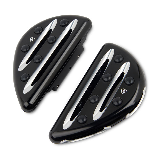 A very visual design style matching the flowing Indian lines. Special rubber inserts offer foot traction and protects the board's black anodized finish with subtle accent cuts. - Black anodized with a Contrast Cut machined finish - Billet aluminum CNC machined - Offers improved space for foot placement - Replaces the stock footpegs - Approx. dimensions: 7" (17.8cm) long x 4" (10.2cm) wide x 1" (2.5cm) thick Note: See 569780 for a style matching shift/brake peg