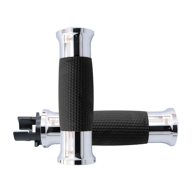 With medium outside diameter. Dimensions: 1.50" (3.8cm) O.D. x 5.5" (14cm) inside length. SA made high quality grip set. An ergonomic grip with the softest rubber available in Avon grips. The dimple texture and tacky feel help reduce road and engine vibrations. Finished with 6061 billet aluminium end caps and collars.