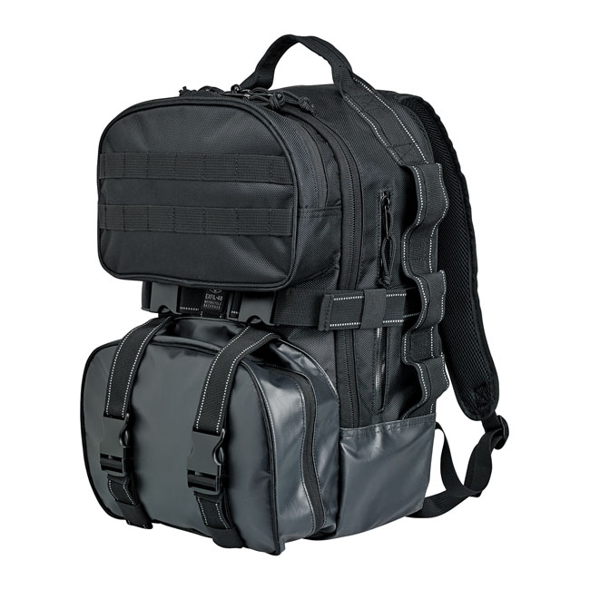 Like all Biltwell EXFIL® gear; the Exfil-48 was designed by bike riders for bike riders. Features include compression straps that do double duty as mounting straps; so you can fasten your backpack to the sissy bar to give your shoulders a break on long rides. Packed with enough storage capacity to gobble up 48 12-ounce cans of your favorite barley pop.• One main and two secondary compartments; each lined with hi-vis orange nylon for speedy contents ID• Lower exterior compartment boasts two zippered pouches and a treated nylon tool caddy• Upper exterior compartment features a zipper pouch for keys and incidentals• Heavy-duty nylon zippers with easy-grab pulls throughout• 1680 denier ballistic nylon outer chassis with PVC coating for moisture resistance and durability• PVC-treated heavy-duty bottom and lower side panels resist water and dirt• Woven nylon cinch and mounting straps with reflective detailing• Molded nylon buckles on cinch straps for speedy mounting on sissy bars• Six heavy-duty; bar-tacked lashing points for loading and mounting options• Padded tablet/laptop pocket inside main compartment• Padded shoulder straps and BioFoam back with ventilated panels for airflow and comfort