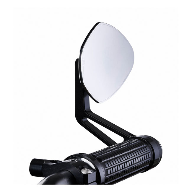 ECE approved; aluminum; Oval; 122mm wide x 83mm high; angled stem 110mm; Motogadget mo.view mirrors are glassless. CNC machined from aluminum and finish-anodized; but a regular glass lens is not used. Instead the patented mirror surface is convex cut directly from the aluminum. This is done with ultra-precision diamond tools using a special ´flycutting´ procedure after which it is made corrosion and scratch resistant by a special vacuum plasma coating process. Available in regular and handlebar-end mirrors. Left & right side compatible; allows above or below bar end installation and mounts directly onto or into 22mm or 1" diameter handlebars. Body thickness approx. 4.2mm without ball head. Note: Installation compatible with Motogadget bar end turn signals; the mo-grip and the push button controls mo-switch and mo-switch mini. Note: Mirror comes with handlebar clamp but optional bar-end adapters (575353 clamp-on or 575352 clamp-in) are available and sold separately.
