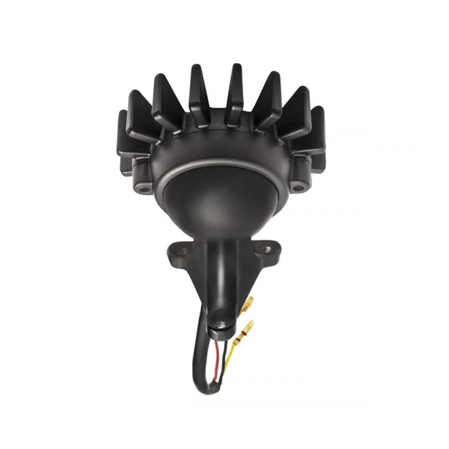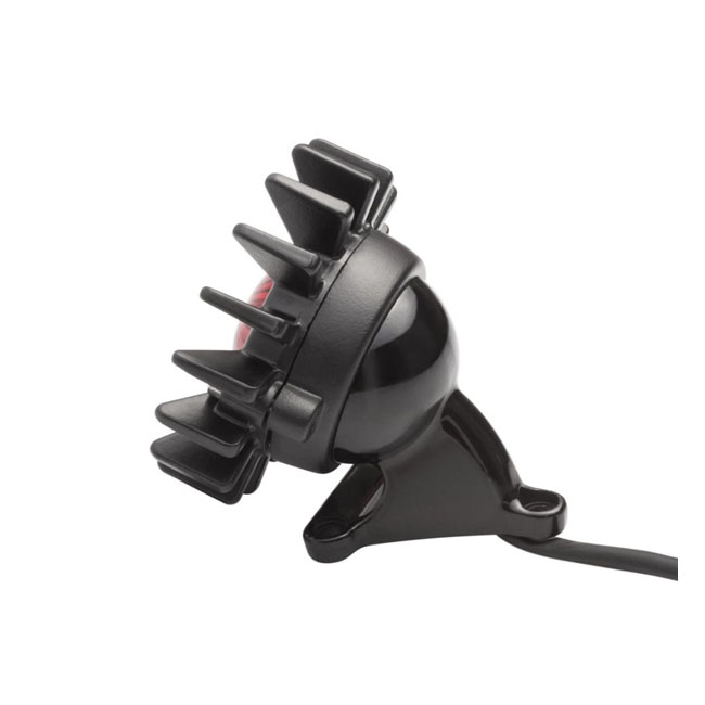 Black. ECE approved. Manufactured from die-cast aluminum but complete with modern and much more vibration-proof LED lighting. License plate illumination is done through a slot in the under side of the taillight body. Includes a style matching mounting bracket with matching rubber mount gasket for 'on fender' use and all required hardware.