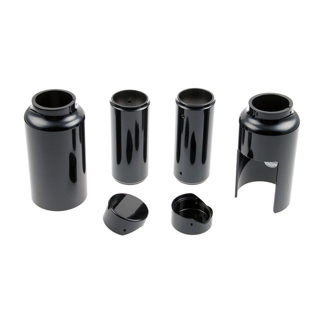 Gloss black powder coated CNC machined aluminum covers. Covers the full front fork from bottom to top of the upper triple tree. Includes aluminum fork tube caps; upper fork covers and smooth black aluminum lower fork covers. Transforms the complete front end to a massive Black-Out muscle bike look. Compatible with stock and custom fenders. Installs with set-screws. All required hardware is included.