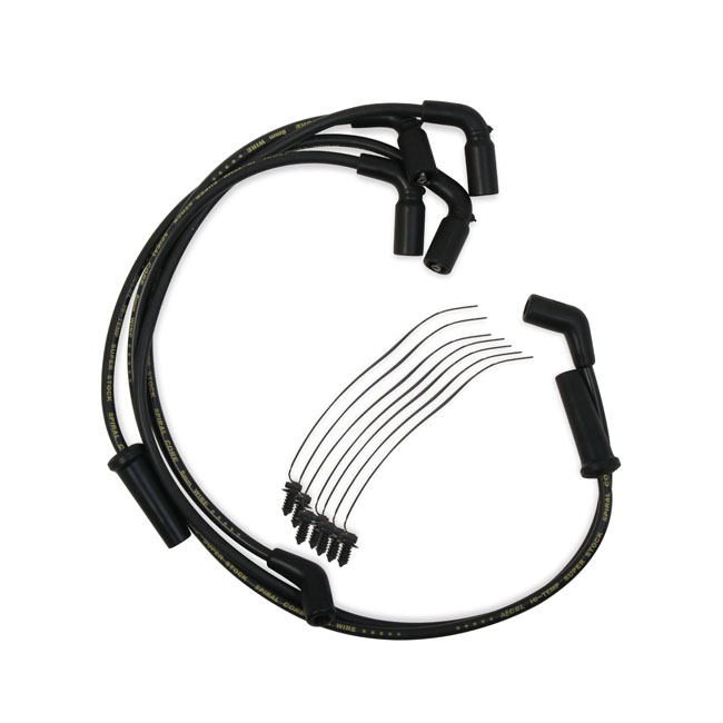 Black wires; with yellow print. With black plug boots and coil boots. Ready to install. Low resistance 500 Ohm/ft. Ferro Spiral core; for maximum energy delivery; with a 8mm thick silicone jacket. The silicone insulation effectively eliminates RFI and EMI interference for a interrupt-free functioning of all on-board electronics. Fully compatible with both carburetor as the Delphi fuel injection systems. High temperature boots withstands over 500°F. Note: Compatible with all H-D ignition systems. If you have an aftermarket ignition; please check with manufacturer ohm requirements.
