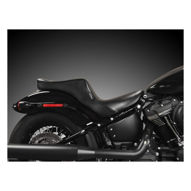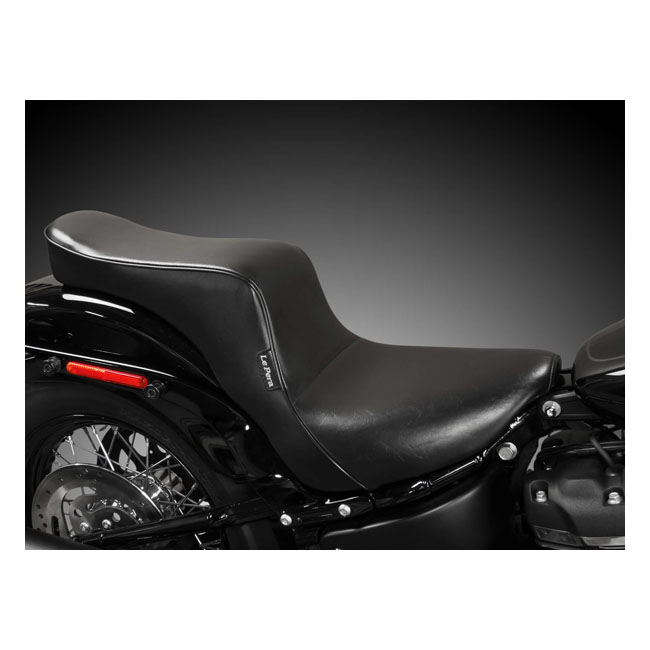 Rider seat 11" wide. Smooth stitch pattern. Back to the roots with this modern version of the classic King & Queen seat with a touch of chopper mixed in. More comfort than you might expect at first glance. The high arched back for the rider provides great lower back support; great for racking up the miles effortlessly. Built with LePera's high-density marathon foam filling on a black powder coated steel baseplate.