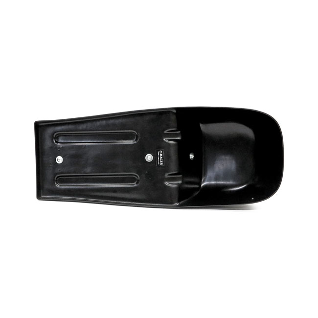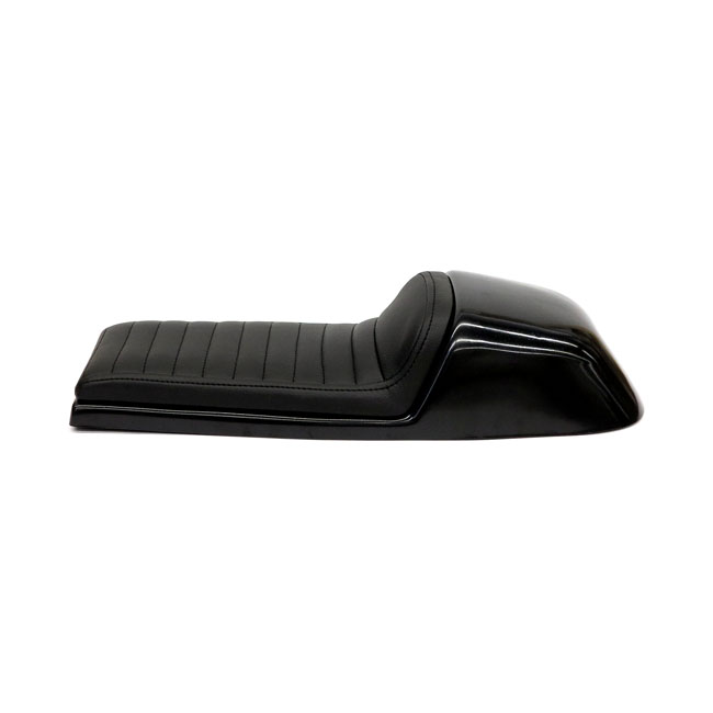 Universal Café Racer seat with a seat upholstery of black synthetic leather. Seat cowl and upholstery base are separate parts and comes with 3 mounting points (M6-Steel plus nuts) for easy installation. Made from unpainted black ABS plastic and comes with 20mm thick seat foam that is covered with a water repellent membrane below the synthetic leather upholstery. Note: Installation modifications may be required.