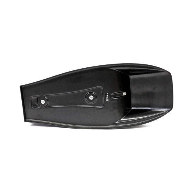 Black synthetic leather upholstery. Universal Flat Track seat that can be adopted to any style custom bike creation that breathes sport. Consists of 2 parts; a seat cowl and the upholstery base with 2 mounting points (M6-Steel plus nuts) that allow easy installation. Made from unpainted black ABS plastic and comes with 20mm thick seat foam that is covered with a water repellent membrane below the synthetic leather upholstery. Note: Installation modifications may be required. Note: See 578704 for optional side number plates for use with 578282 and 578583 SCR4 C-Racer seats.
