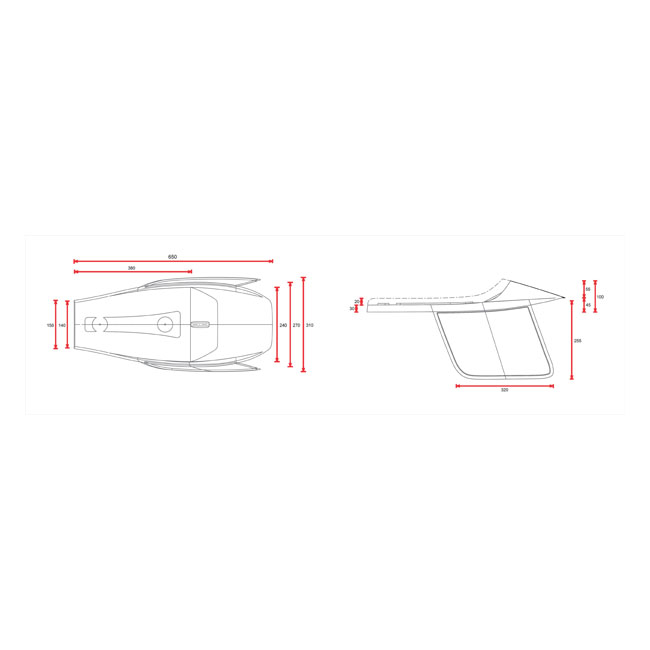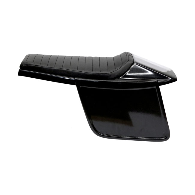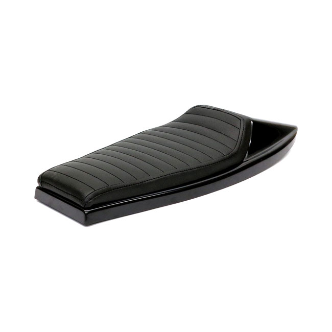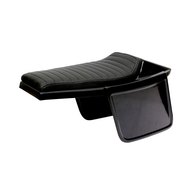 Black synthetic leather upholstery. Universal Flat Track seat with adjustable side number plates. Consists of 4 parts; a seat cowl; the upholstery base with 2 mounting points (M6-Steel plus nuts) to allow easy installation and the two side number plates. Made from unpainted black ABS plastic and comes with 20mm thick seat foam that is covered with a water repellent membrane below the synthetic leather upholstery. Note: Installation modifications may be required.
