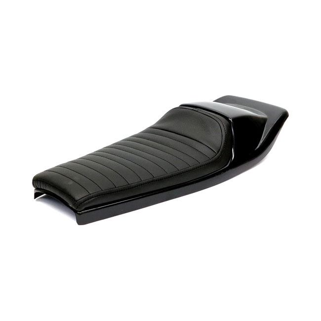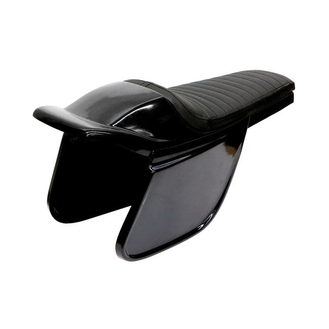 Black synthetic leather upholstery. This universal flat track seat was inspired by the legendary Honda Bol d'Or; making it different but a classic in its own right. Consists of 4 parts; a seat cowl; the upholstery base with 2 mounting points (M6-Steel plus nuts) to allow easy installation. The vintage style number plates are bolt-on type. Made from unpainted black ABS plastic and comes with 20mm thick seat foam that is covered with a water repellent membrane below the synthetic leather upholstery. Note: Installation modifications may be required.