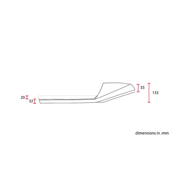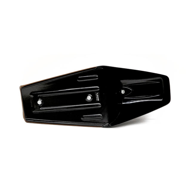 Dark brown leather upholstery. Universal café racer seat in a late-model styling. Consists of 3 parts; a seat cowl; a diamond shaped synthetic leather tongue and the upholstery base with 2 mounting points (M6-Steel plus nuts) to allow easy installation. Made from unpainted black ABS plastic and comes with 20mm thick seat foam that is covered with a water repellent membrane below the synthetic leather upholstery. Note: Installation modifications may be required.