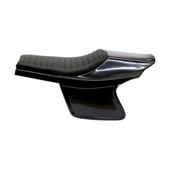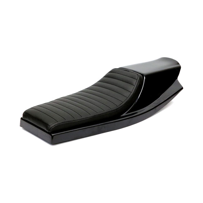Black synthetic leather upholstery. Universal 80's spoiler inspired flat track seat; with adjustable side number plates; for a flat track bike or any other custom bike you feel it needs this seat. Consists of 4 parts; a seat cowl; the upholstery base with 2 mounting points (M6-Steel plus nuts) to allow easy installation. The vintage style number plates are bolt-on type. Made from unpainted black ABS plastic and comes with 20mm thick seat foam that is covered with a water repellent membrane below the synthetic leather upholstery. Note: Installation modifications may be required.