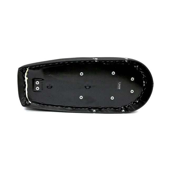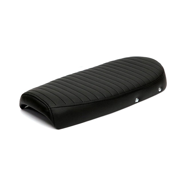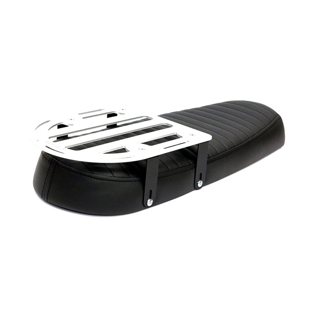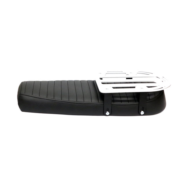 With luggage rack. Black synthetic leather upholstery. Universal scrambler seat; with a fraction additional padding in the tail. Sometimes simplicity reigns supreme; and it does it seriously well with this flat seat for a scrambler or even tracker motorcycle. This kit consists of 2 parts; the Scramsadle seat and an aluminum detachable luggage rack. Maximum load of the rack is 5 kg. The seat has 6 mounting points (M6-Steel plus nuts) to allow easy installation. The base is made from unpainted black ABS plastic and comes with 40mm thick seat foam that is covered with a water repellent membrane below the synthetic leather upholstery. Note: Installation modifications may be required.