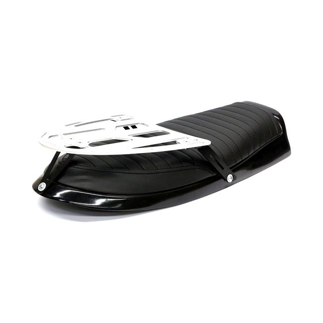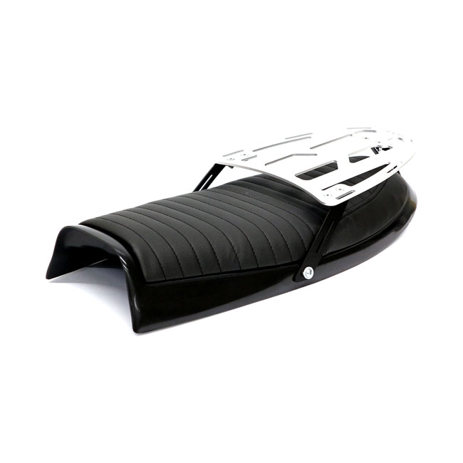 C-Racer BMW R100 Scrambler seat 02 blackScrambler seat with luggage rack; Black seat & unpainted black seat pan; seat foam 40 mm thick; synthetic leather; seat pan ABS plastic