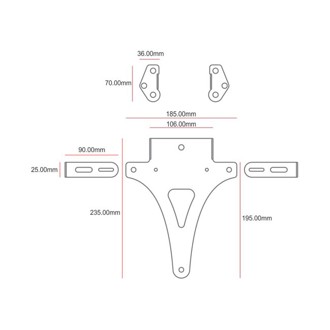 Black powder coated steel license plate bracket for universal applications. Installs under the rear fender or seat. The mounting bracket is angle adjustable and the turn signal brackets are equipped with slots; making them width adjustable. Complete with hardware. Note: Installation modifications may be required.