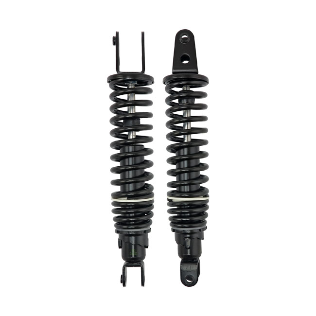 Black springs; black damper; black shroud. OEM style reproduction rear shock absorbers for stock style replacement. Shock absorber set length 330mm. Comes with dual springs with clevis to clevis mounting.