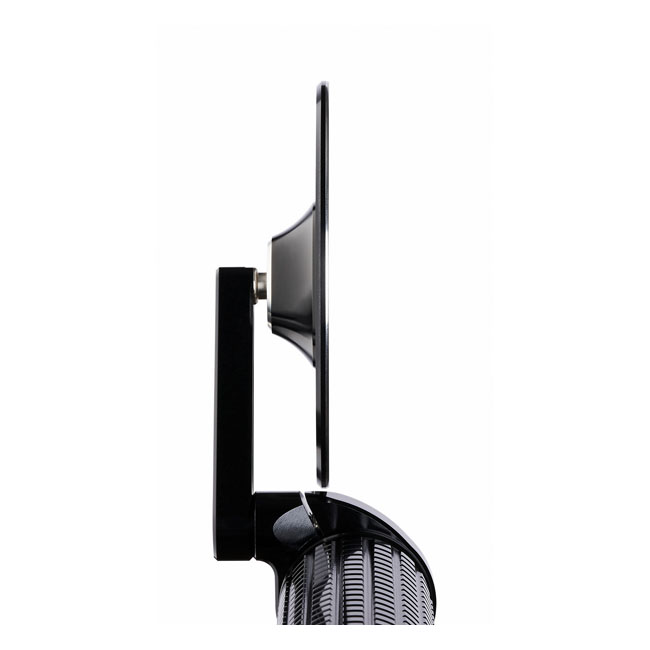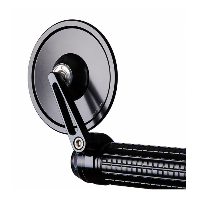 ECE approved; handlebar end mirror; aluminium; Round; 96mm diameter; Stem length 60mm. Motogadget mo.view mirrors are glassless. CNC machined from aluminum and finish-anodized; but a regular glass lens is not used. Instead the patented mirror surface is convex cut directly from the aluminum. This is done with ultra-precision diamond tools using a special ´flycutting´ procedure after which it is made corrosion and scratch resistant by a special vacuum plasma coating process. Available in regular and handlebar-end mirrors. Left & right side compatible; except where noted; allows above or below bar end installation and mounts directly onto or into 22mm or 1" diameter handlebars. Body thickness approx. 4.2mm without ball head. Note: Installation compatible with Motogadget bar end turn signals; the mo.grip and the push button controls mo.switch and mo.switch mini. Note: Mirror comes with handlebar clamp but optional bar-end adapters (575353 clamp-on or 575352 clamp-in) are available and sold separately.