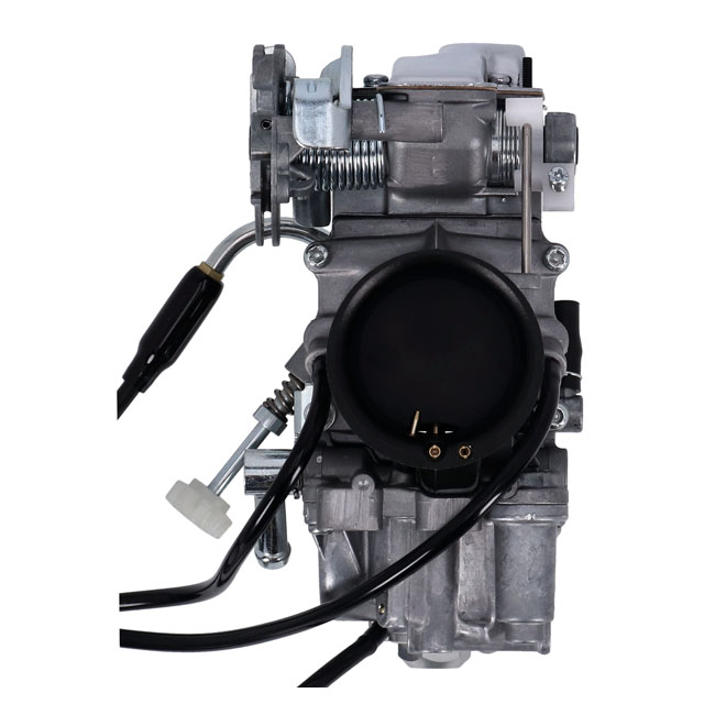 Mikuni's TM Series flat side carburetors provide a significant performance improvement over older round slide carburetors. Air flows faster and smoother through the TM Series venturi and jet blocks due to the flat slide design which help create a smooth bore effect. The high velocity air flow means a stronger vacuum at the needle jet for more precise metering; better throttle response. - Carb only; choke cable included - HS40. Note: This is the early HS40 carburetor; without roller bearings that support the throttle slide. Includes choke cable.
