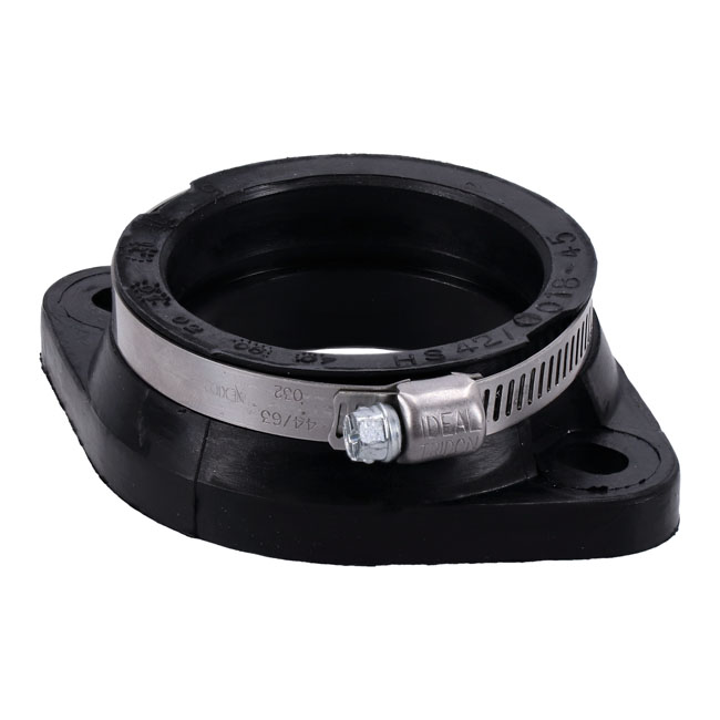Mikuni, rubber manifold adapter HSR45Fits HSR45 using stock Mikuni 2-bolt manifold; black rubber flange with worm drive hose clamp