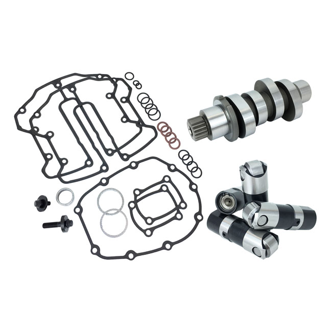 Bolt-in. .445" int.; .465" exh. Good bottom end but above 2800 RPM it produces solid performance gains over stock. Free breathing slip-on mufflers / exhaust and air cleaner are recommended for best results. 1850-5950 RPM. Compatible with stock length pushrods and valve train components. Includes the cam; cam bearing; cam/crank hardware pushrod seals; cam cover gasket; rocker cover gaskets and a set of high performance Race Series hydraulic lifters. Complete kit ready to install; no other parts required required.