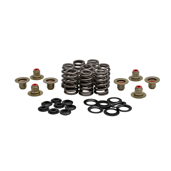 Includes steel top collars; chrome siilicone Beehive style springs and OEM style KPMI manufactured red Viton valve seals. Installed height 1.550". Installed spring pressure 85 lbs. Open pressure 257 lbs@.550 valve lift. Compatible with standard 6mm valve stem diameter. Note: Does not include valve keys; OEM valve keys can be re-used.