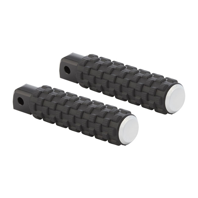 Chrome end cap. These foot pegs come with a special aggressive design grip-surface that looks bold and ready to do serious business. The looks don't deceive. The pegs give exceptional grip and the forged steel reinforcements give it maximum strength. The addition of 1" foot peg width provides more foot space. Includes a CNC machined billet end cap with engraved Arlen Ness logo.