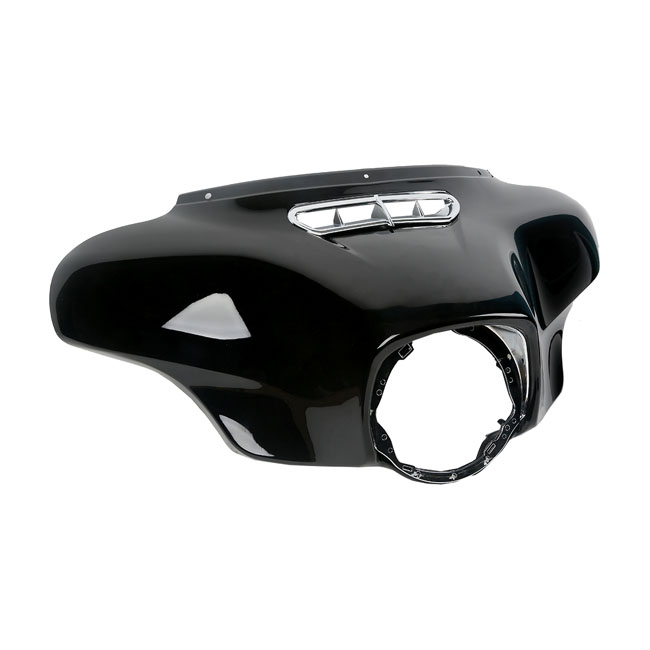Gloss black. Heavy duty ABS construction. OEM style traditional Batwing (early style) outer fairing for stock style replacement. OEM replacement reference 57000383. Note: Fitment checks are required before painting and final assembly.