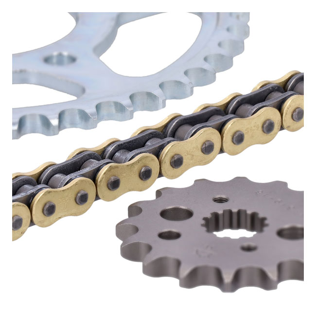 High quality chain & sprocket kit featuring Tsubaki's 525 Sigma gold X-ring chain combined with a JT front steel sprocket and a JT rear steel sprocket.
