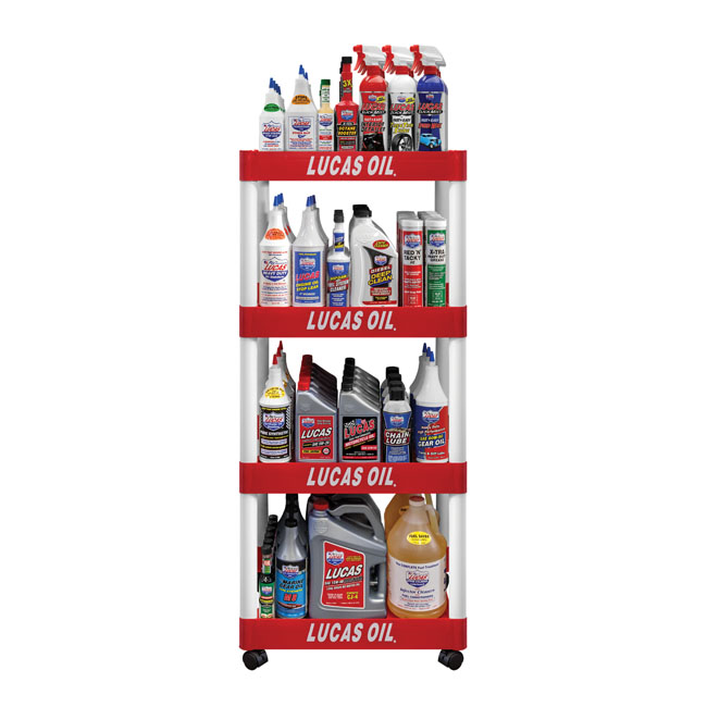 If you're looking to a way to professional display Lucas products in your shop; this is it. Manufactured of a sturdy plastic with a gloss red finish with white legs. Approx. dimensions: 138cm high; 59.5cm wide; 43.5cm deep and 34.5cm space between the shelfs.