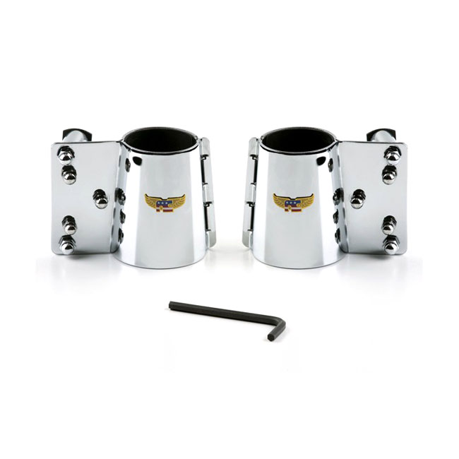 NC Heavy Duty™ Mount kit, Tapered forksChrome. These custom brackets mount to the outside of the tapered covers on the fork tubes. For National Cycle Beaded; Touring & Chopped (wide frame) Heavy Duty™ windshields.