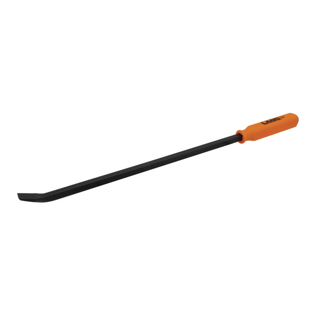 25" (63.5cm) long. Curved pry bars manufactured from a high carbon content steel alloy with an orange nylon grip. The tip is angled for best access and leverage. With steel strike cap that is directly connected to the steel of the bar itself. Exceeds ASME (American Society of Mechanical Engineers) standards.