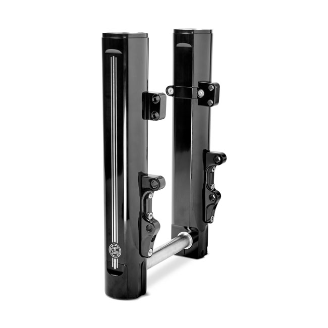 Gloss black anodized Contrast Cut machined finish. Bolt-in wide tire fork slider & cover kit for 49mm fork legs; designed for a bolt-in fit with 18x5.50 Performance Machine series wheels (separately available); running a 180 series front tire. This kit includes sculpted fork sliders with triple machined pinstriping and a Performance Machine logo; a clean looking hidden axle design; with the axle included; axle covers; pre-installed caliper mounts that work with the 180 series tires and chrome plated hardware. The matching style fork slider covers will fit as a direct replacement for the OEM covers. Takes OEM H-D or OEM H-D mount style compatible calipers as Performance Machine calipers. Note: Compatible with PM and RSD 18x5.50 wheels. For dual disc ABS models see 599396; 599397; 599392; 599393; 599394; 599395 wheels and for dual disc non-ABS models see 599389; 599391; 599386; 599387; 599388; 599389 wheels.