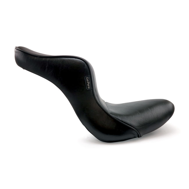 Foam. Rider seat 11" wide; passenger seat 6.5" wide. Smooth stitch pattern. Back to the roots with this modern version of the classic King & Queen seat with a touch of chopper mixed in. More comfort than you might expect at first glance. The high arched back for the rider provides great lower back support; great for racking up the miles effortlessly. Built with LePera's high-density marathon foam filling on a 16-gauge black powder coated steel base plate.