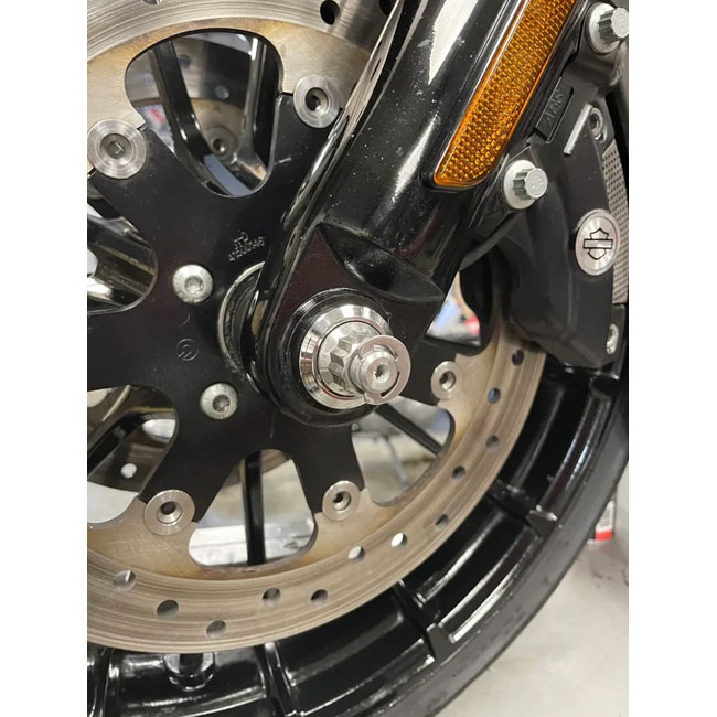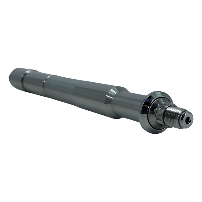 Offers great and lasting custom looks. Made from 17-4 series polished stainless steel; which offers sheer and tensile strength comparable to that of chromoly with superior corrosion resistance. Axle will not bend or break and is ball burnished for the toughest bearing surface. Comes with a high quality 12-point stainless steel nut and custom tapered washer. Nut is secured by a stainless steel e-ring. Comes complete with instructions and anti-seize. OEM replacement reference 43364-00. Note: Axle and nut must be 100% clean before installation and coated with provided anti-seize (Loctite LB8012). This includes 'test fitting / hand tightening'. Cleaning axle; threads and anti-seize coating remains applicable when reinstalling after servicing wheel.
