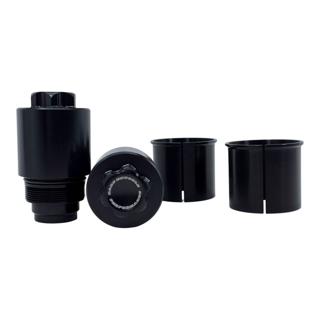 Black anodized aluminum. Extends your fork tubes of your inverted front fork by 2" (51mm). This simple kit allows you to efficiently lift your Low Rider S front suspension and gain more ground clearance for more aggressive cornering. The extended top cap installs in place of the stock top cap; while the lower tube bushing properly adapts the tapered area of the tube to the lower triple tree. Note: May require extended lower brake line.