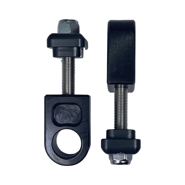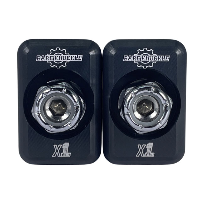 XL logo & 'Bare Knuckle Performance' engraved. Black anodized aluminum construction. Time to update your swingarm with some precision detailing. A simple 5 minute job to exchange your stock steel plates with the new aluminum adjustment plates. Complete with adjustment plates and chrome plated washers and nyloc nuts. OEM replacement reference 47554-73
