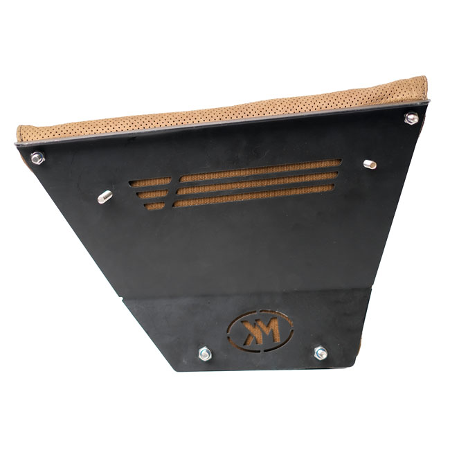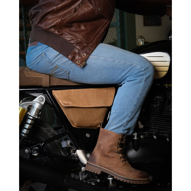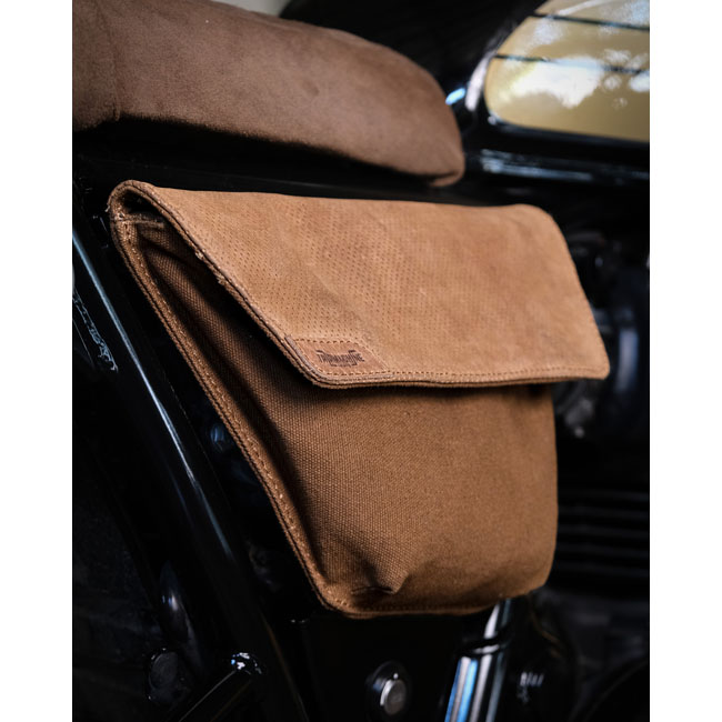 Right side. The Renegade side panel bag is perfect blend of rugged leather and durable canvas. A slim; combat-inspired bag made for quick access with just one hand; even while on the go.Built on the sturdy MK design plates; it hugs the bike seamlessly without compromising storage space. The waterproof lining inside and included rain cover ensure your essentials stay dry no matter the conditions.Crafted with Trip Machine’s signature quality; this bag is built to withstand the road and age beautifully over time. - Increased comfort on the inner thigh - Easy access to gear - heavy duty 14 oz canvas amalgamated with our signature leather - With rain cover. Dimensions: 30cm upper width x 14cm lower width x 21cm high x 3cm deep. Max capacity: 1.8 liter