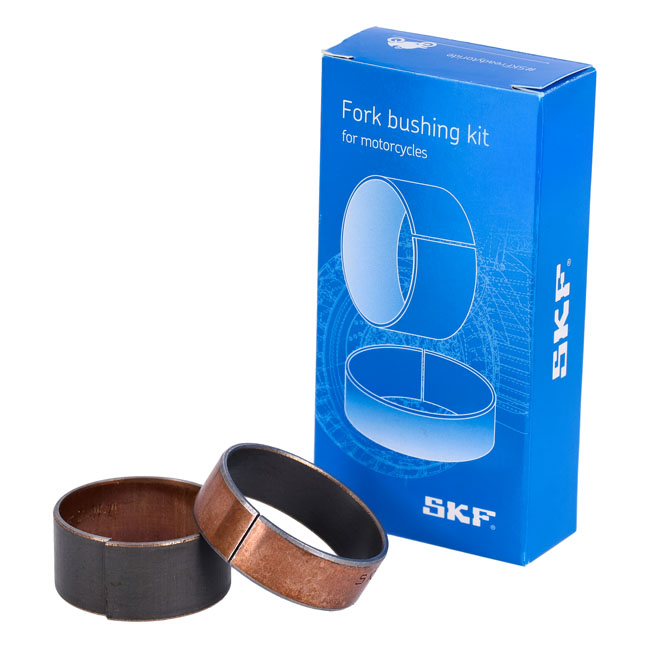 Replacement for 46516-01 upper and 46080-01 lower fork slider bushing. Dimensions: Upper bushing 52x15x1.5mm; lower bushing 50x20x1mm. Kit includes 1 upper and 1 lower fork slider bushing. Enough to service one fork leg. Order 2 kits for one motorcycle. Used inside the lower fork slider to guide the fork tube. Bushings are plated steel; the PTFE coated inner lining reduces friction / fork-stiction over other materials. This super slick surface provides smooth suspension and helps reduce friction and wear. Used inside the lower fork slider to guide the fork tube. The SKF composite bushings are copper plated stainless steel; with a PTFE based inner lining to help reduces friction / fork-stiction better than other materials. To enhance heat dissipation during operation; a thin bronze layer forms a robust bond between the backing and sliding surface. The super slick sliding surface provides smooth suspension and does a great job in reducing friction and wear. - PTFE based low friction seal - Low stiction - No maintenance - Low friction under side load - High load carrying capacity - Temperature stable - Small operating clearance for improved guidance - Dimensions marked for quick identification