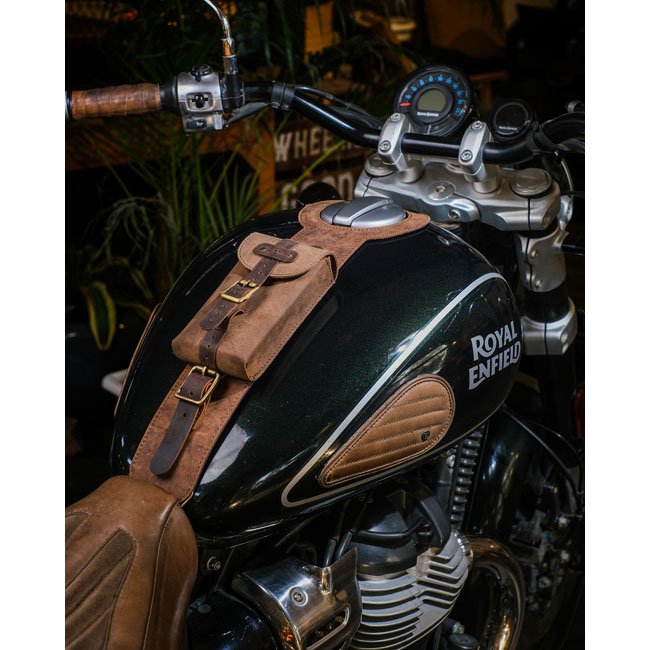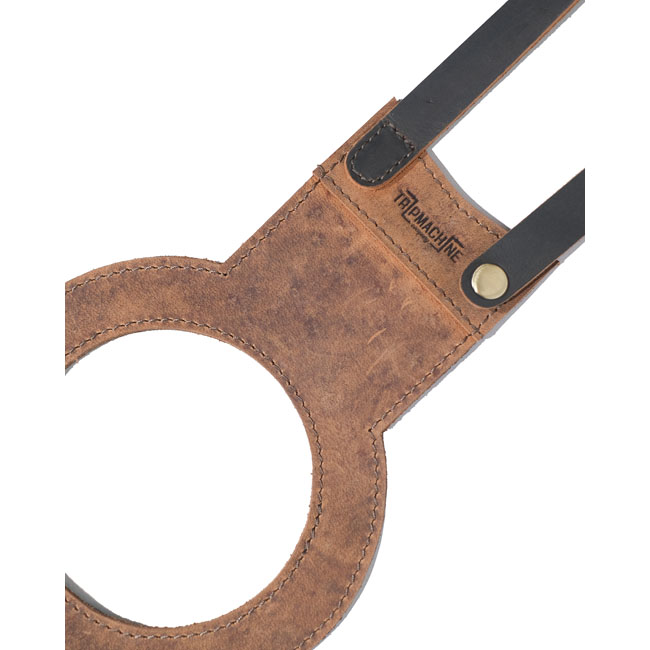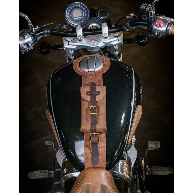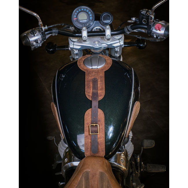 Elevate your ride with the Trip Machine Tank Strap; crafted from premium; durable leather that ages beautifully with every journey. Designed for a seamless vertical mount; it fits your tank perfectly while protecting it in style. Fully adjustable straps ensure a custom fit; and a precise fuel cap cutout adds functional elegance. The blend of smooth and waxed leather offers a rugged yet refined look; transforming your tank into a statement piece. Pair it with the Trip Machine utility pouch for secure storage on the bike and versatile use off it. Dimensions are about 63 x 6.5 cm.