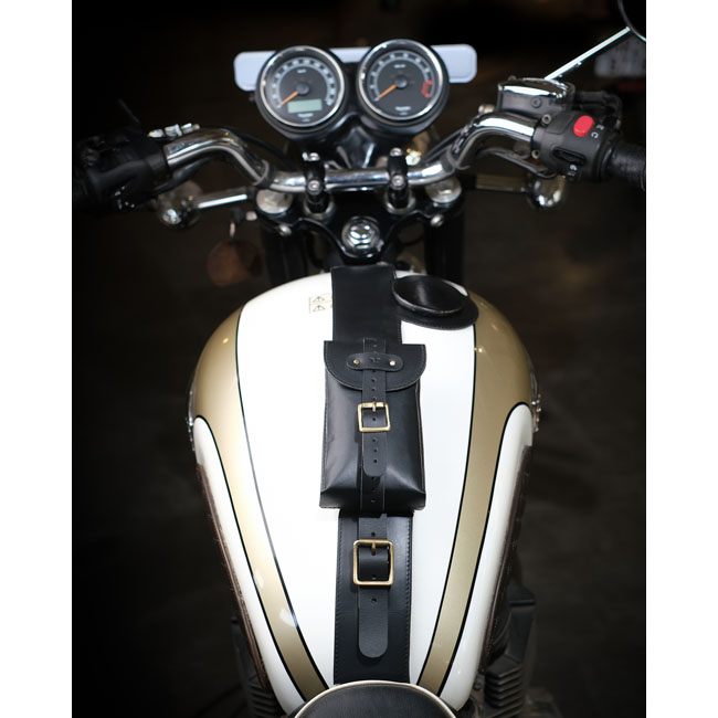 Elevate your ride with the Trip Machine Tank Strap; crafted from premium; durable leather that ages beautifully with every journey. Designed for a seamless vertical mount; it fits your tank perfectly while protecting it in style. Fully adjustable straps ensure a custom fit; and a precise fuel cap cutout adds functional elegance. The blend of smooth and waxed leather offers a rugged yet refined look; transforming your tank into a statement piece. Pair it with the Trip Machine utility pouch for secure storage on the bike and versatile use off it. Dimensions are about 63 x 6.5 cm.
