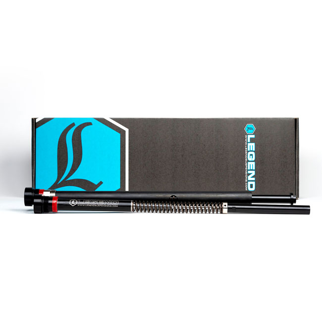 Replaces the asymmetrical stock fork internals with a high-performance twin cartridge set. This set includes two mono-tube; dual-chambered damper cartridges; a performance rate spring set and a machined 303 Stainless threaded pre-load adjuster. The internal linear spring guide and polyurethane bump stops are unique to this Legend Axeo43 system. the ride quality is smooth and controlled. Improves stability; cornering; and traction. Eliminates front-end dive during aggressive braking and maneuvering. Firm feel for high-speed sweeping turns. Eliminates bottoming out on large bumps or potholes. Reduces dragging floorboards and pegs. Designed for optimum performance with Legend rear suspensions. Designed to be used with stock diameter front wheels. Easy installation. Note: Incorporates static sag to shorten overall fork tube length by approximately 1/2"; resulting in weight transfer to the front wheel for improved handling. Note: Does not fit Softails with conventional forks.