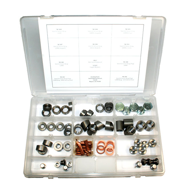 Manufactured from 1215 steel. Kit include quantity 5 of an assortment of 18 & 12 mm bungs; plugs anti-seize compound and copper washers. Includes: 18mm bungs - 3/8". 18mm bungs - 1/2" with step. 18mm bungs - 1" angled. 18mm bungs - 1" straight. 18mm plugs - 1" Hex head. 18mm plugs - 5/16" Allen head. 18mm copper crush washers (Qty. 10). 12mm bungs - 5/16" with step. 12mm bungs - 1/2". 12mm plugs - 5/8" Hex head. 12mm plugs - 6mm Allen head. Anti-Seize compound packets (Qty. 10).