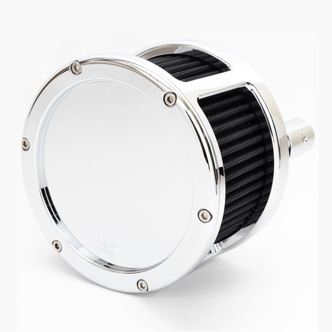 Black filter. Chrome plated finish. Race Series. Tall cage & extra (3.335") wide filter for ultimate flow. Mid controls required for leg clearance. Max flow 697 CFM@28. Compatible with 68mm and 70mm throttle bodies. Out of the box; this Feuling air cleaner is set up with OEM style cylinder head breathing; routing into the intake with optimized vent hole locations to meet emissions standards. External Race Only venting to atmosphere available with separate purchase of Feuling 707101 external breather kit which includes fittings; vent line and breather element. The backing plate is engraved with both 'Made in USA' and 'Feuling' logos. A lot of meticulous testing and tweaking went into the design of the bolt-on BA (Billet Aluminum air cleaner); to create excellent performance; all paired with the smallest possible dimensions. Full one-piece billet aluminum cage; the included velocity stack drops in; followed by the air filter element after which the cover is installed. This simple construction gives a very clean look and easy installation when compared to many others. The velocity stack is used to lengthen the intake track and increase intake velocity to improve cylinder fill especially midrange performance; where most riding is done; and up. Comes with a reusable high flow cotton based red pre-oiled air filter element. Note: Optional covers are available in raw polished; hard anodized black and chrome plated in a solid or clear (see-through) acrylic outer cover. Origi