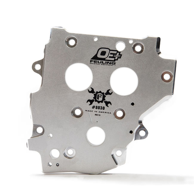 Direct bolt-in replacement for the stock cam plate with stock mechanical chain tensioners. For use with non-stock gear drive camshafts. FEULING OE+ stock replacement billet cam plates are manufactured from 6061 aluminum providing increased rigidity and machined to FEULING's high tolerance standards. The pressure relief valve and spring are pre-set; matched and seated by FEULING with a full pop off pressure of 50-60 psi. OE+ cam plates are a direct bolt in replacement and will accept the factory oil pump. As with all FEULING components; the competitively priced OE+ cam plates are designed and manufactured to the highest standard of quality with proven FEULING performance.Includes bearing retainer plate & hardware; for use with any 99-06 style oil pumps. Compatible Feuling oil pumps: 566075; 707377; 707381