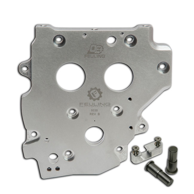 Direct bolt-in replacement for the stock cam plate with stock mechanical chain tensioners. Repl. 24607-99. NOTE : This cam plate is designed for the original fitment mechanical spring tensioners. For hydraulic conversion cam plate see part 566082; 707241FEULING OE+ stock replacement billet cam plates are manufactured from 6061 aluminum providing increased rigidity and machined to FEULING's high tolerance standards. The pressure relief valve and spring are pre-set; matched and seated by FEULING with a full pop off pressure of 50-60 psi. OE+ cam plates are a direct bolt in replacement and will accept the factory oil pump. As with all FEULING components; the competitively priced OE+ cam plates are designed and manufactured to the highest standard of quality with proven FEULING performance.Includes bearing retainer plate; tensioner pins & chain guide tower; for use with'99-'06 style oil pumps; compatible FEULING oil pumps: 566075; 707377; 707381