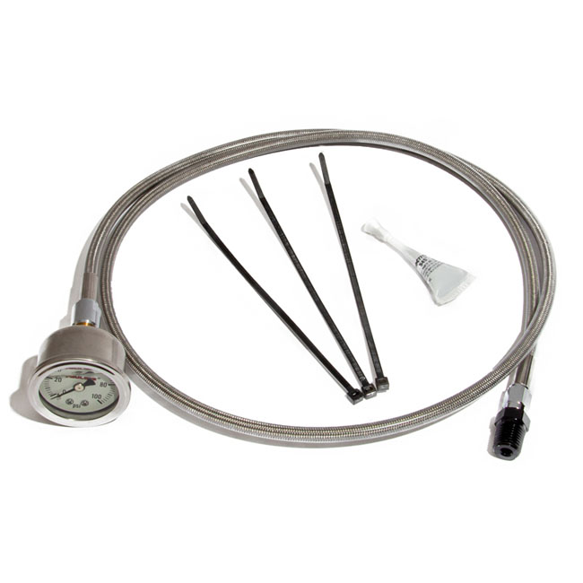 Used to additionally check engine oil pressure with a liquid filled mechanical stainless gauge; with PSI face; while keeping your factory electronic gauge and or low oil pressure indicator light hooked up. Kit includes all needed fittings to hook up the engine. Line is 45" (114cm) long. Hooks up to existing oil psi ascending unit port; oil line routes up the right side frame rail; gauge fastens to the handlebars using zip-ties and spacers. Hooks up to the engine case via the pressure port to the oil filter; remove the factory 1/4 NPT plug and install the Feuling fittings.