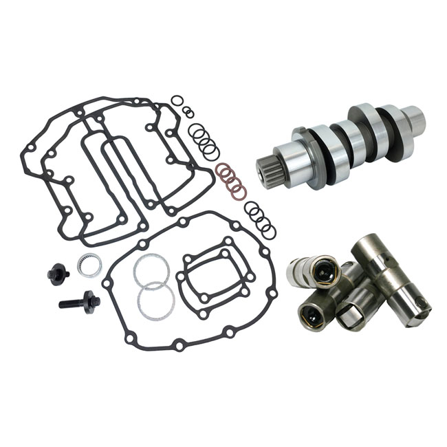 Chain drive. HP+ kits comes with HP+ lifters. This Feuling M8 camshaft kit includes chain drive camshaft; HP+ lifters and a cam installation kit that includes cam bearing; cam/crank hardware and a gasket/O-ring kit that allows for install of the factory one-piece pushrods. Feuling recommends the optional 993528 Feuling one-piece heavy duty HP+ pushrod kit; with 0.165" wall thickness. Feuling recommends rocker box fastener kit 707450 to help prevent cylinder head cracking; this kit replaces the rocker shaft bolts with studs and nuts to help reduce the stress on the rocker shaft standoffs.472 CAM - The 472 Reaper is a great allround camshaft for 4-1/2 stroke 114" - 117" looking for a little more than our 465 grind and wanting a bolt-in. The 472 has a great bottom end with substantial gains above 2;900 RPM when compared to stock. Responds very well to increased bore and or compression; exhaust system and air cleaner. Use of performance valve-springs is not required but may result in a quieter; smoother running valve-train. See Feuling's Endurance Beehive valve spring kits 993530 (reuse OEM steel top collars) or 588021 (with titanium top collars). Valve Lift Open Close Duration @ 50" lift @ TDC Lobe CenterlineIntake .468 8 BTDC 25 ABDC 213 .117 98.5 Exhaust .472 50.7 BBDC 7.75 ATDC 238