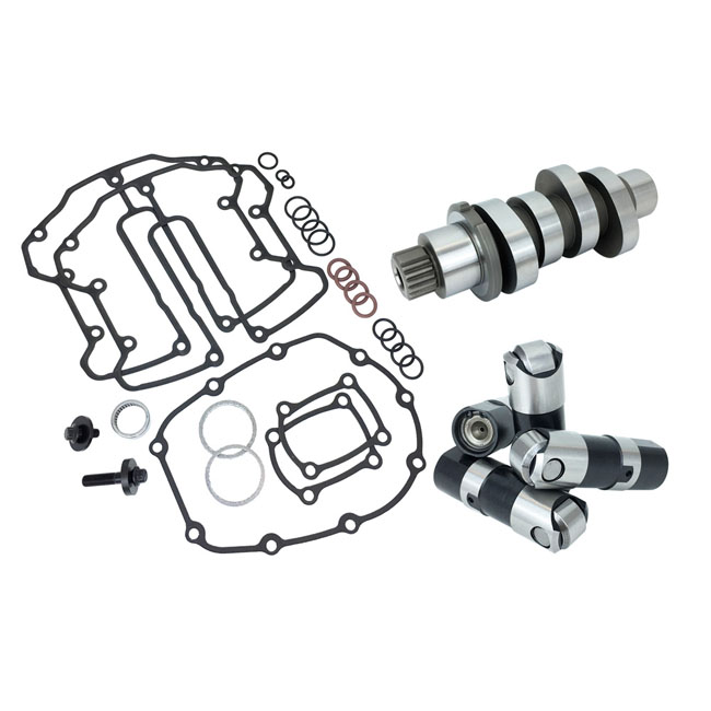 Chain drive. This Feuling M8 camshaft kit includes chain drive camshaft; Race Series lifters and a cam installation kit that includes cam bearing; cam/crank hardware and a gasket/O-ring kit that allows for install of the factory one-piece pushrods. Feuling recommends the optional 993528 Feuling one-piece heavy duty HP+ pushrod kit; with 0.165" wall thickness. Feuling rocker box fastener kit 707450 is also highly recommend to help prevent cylinder head cracking; this kit replaces the rocker shaft bolts with studs and nuts to help reduce the stress on the rocker shaft standoffs.HP+ kits come with HP+ lifters and RACE SERIES kits come with RACE SERIES lifters508 CAM - 'The Grim Reaper' Aggressive pulling power with a "nasty" sound. This camshaft revs up faster than the 521 grind; sounds nastier and pulls harder but is more difficult to tune. The REAPER 508 grind will shine in 114" and larger cubic inch engines with added compression ratio. Ported cylinder heads are not required but will complement the cam and add even more pulling power throughout the range. The stock throttle body produces an excellent powerband and use of a high flow throttle body will increase peak power numbers. A high flow exhaust system and air cleaner is highly recommended for optimal performance. FEULING recommends matching this cam with the RACE SERIES oiling system 707407.NOTE: High Lift valve springs are required on stock cylinder heads; see FEULING BEEHIVE valve spring kit 993530 or 588021.