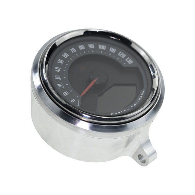 Raw machined aluminum finish. Allows you to relocate the stock gauge to a more visible and ergonomic position. Encases your stock Harley gauges and mounts in a variety of different ways. Whether you use the Kraus 984606 Universal T-Bar Clamp Mount or 984620 Isolated Riser Top Mount; you can place your gauge exactly where you want it. - All billet aluminum anodized construction - Light and compact